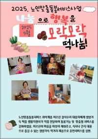 3433 | ![]() | 2025.09.24.(¼ö)³ëÀθÂÃãµ¹º½¼ºñ½º Ãß¼®¸ÂÀÌ ´ãÀïÀ̳ÕÄðºÀ»ç´ÜÈÄ¿ø 9¿ù ¹ÝÂù Áö¿ø»ç¾÷ | 2025-09-30 | 40 |