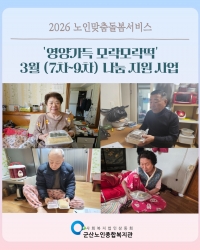 | 3611 | ![]() | [2026. 3. 1.~ 3. 31.] 2026³ëÀθÂÃãµ¹º½¼ºñ½º ¸ð¶ô¸ð¶ô¶± 3¿ù(7Â÷~9Â÷) ³ª´® Áö¿ø»ç¾÷ | 2026-04-07 | 20 |