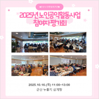 3445 | ![]() | [2025. 10. 16.(¸ñ)] ³ëÀÎÀÏÀÚ¸® ¹× »çȸȰµ¿Áö¿ø»ç¾÷ °øÀÍȰµ¿ Âü¿©ÀÚ Æò°¡È¸ | 2025-10-16 | 25 |
