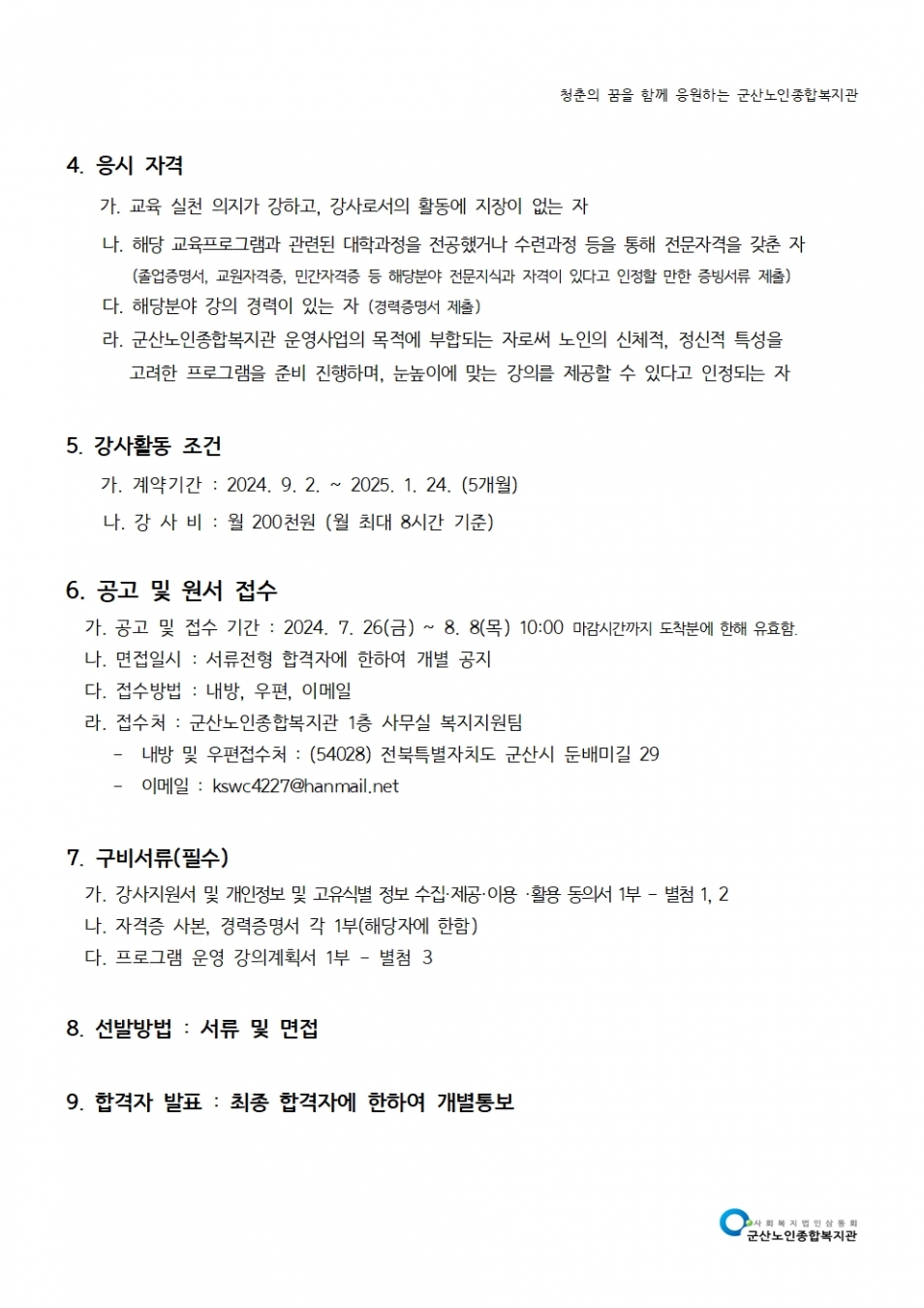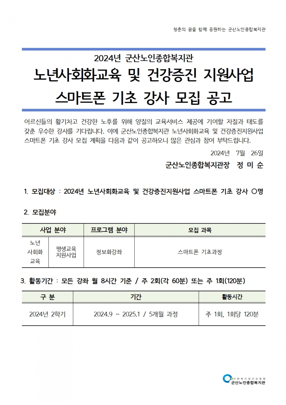 [±º»ê³ëÀÎÁ¾ÇÕº¹Áö°ü] 2024³â ³ë³â»çȸȱ³À° ¹× °Ç°ÁõÁø Áö¿ø»ç¾÷ ½º¸¶Æ®Æù ±âÃÊ °»ç ¸ðÁý ¼·ù ¾ç½Ä.hwp (80.5 KB)