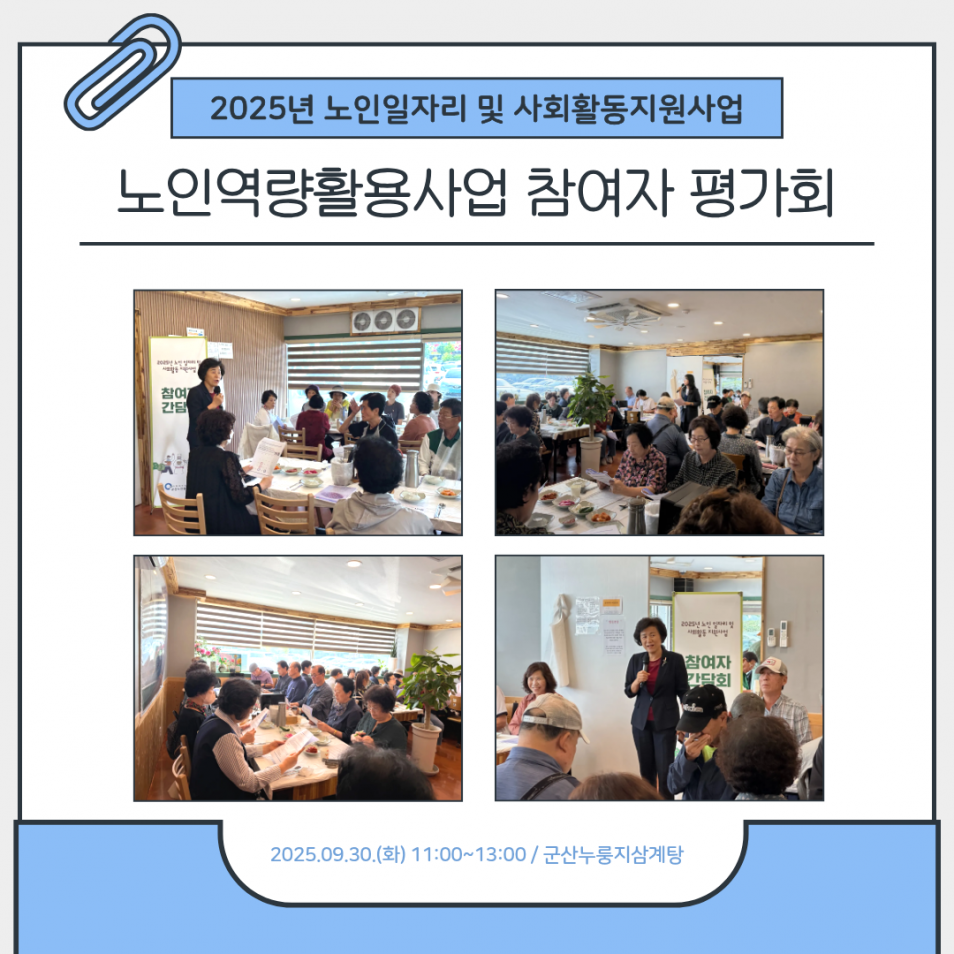 ³ëÀοª·®È°¿ë»ç¾÷ Âü¿©ÀÚ¸¦ ´ë»óÀ¸·Î 9¿ù Âü¿©ÀÚ Æò°¡È¸¸¦ ÁøÇàÇÏ¿´½À´Ï´Ù.