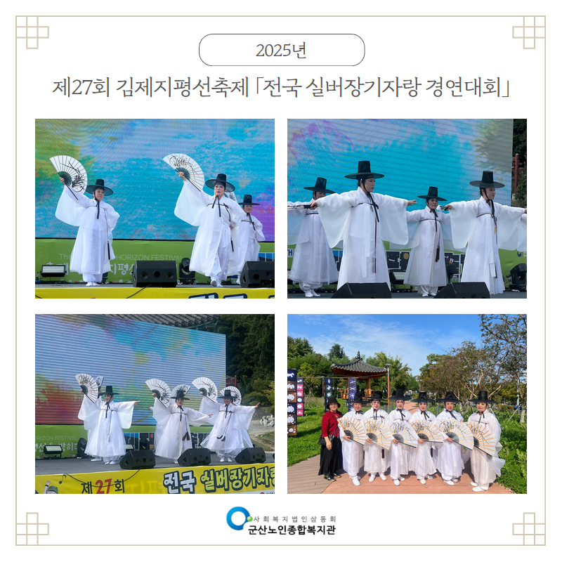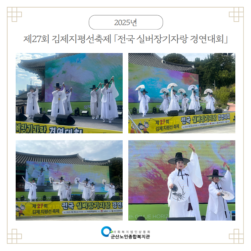 Á¦27ȸ ±èÁ¦ÁöÆò¼±ÃàÁ¦ ¡¸Àü±¹ ½Ç¹öÀå±âÀÚ¶û °æ¿¬´ëȸ¡¹¿¡ ±º»ê³ëÀÎÁ¾ÇÕº¹Áö°ü Çѱ¹¹«¿ëÆÀÀÌ ¹«´ë¿¡ ÃâÀüÇÏ¿´½À´Ï´Ù.
