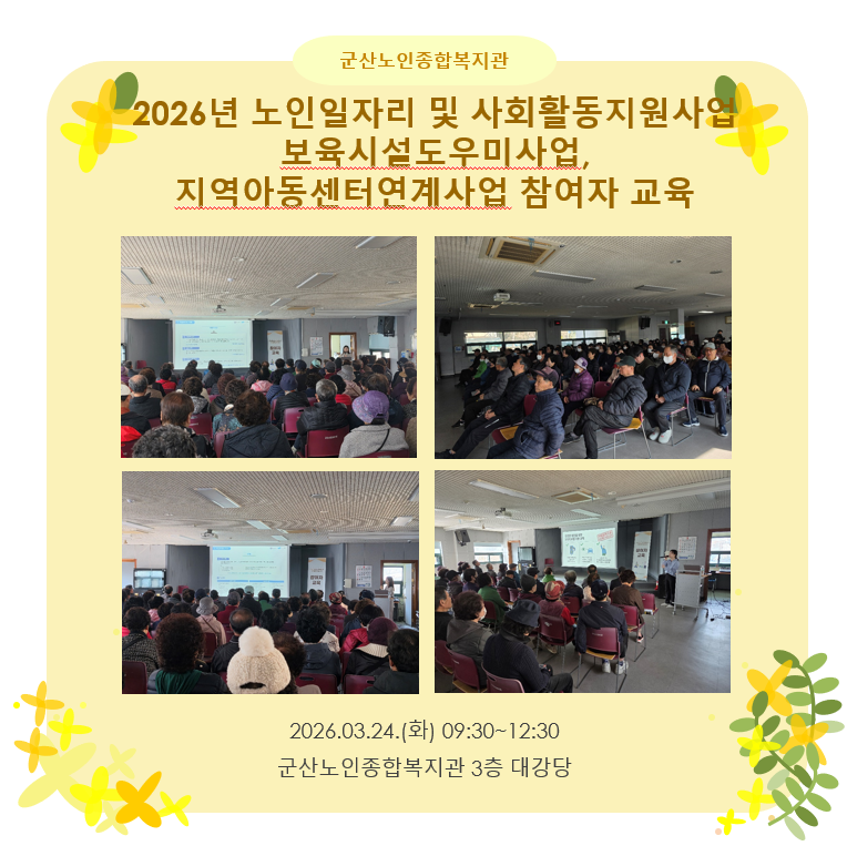 ±º»ê³ëÀÎÁ¾ÇÕº¹Áö°ü¿¡¼´Â 2026³â ³ëÀÎÀÏÀÚ¸® ¹× »çȸȰµ¿ Áö¿ø»ç¾÷ ³ëÀΰøÀÍȰµ¿»ç¾÷ Âü¿©ÀÚ¸¦ ´ë»óÀ¸·Î ±³À° ÁøÇàÇß½À´Ï´Ù.